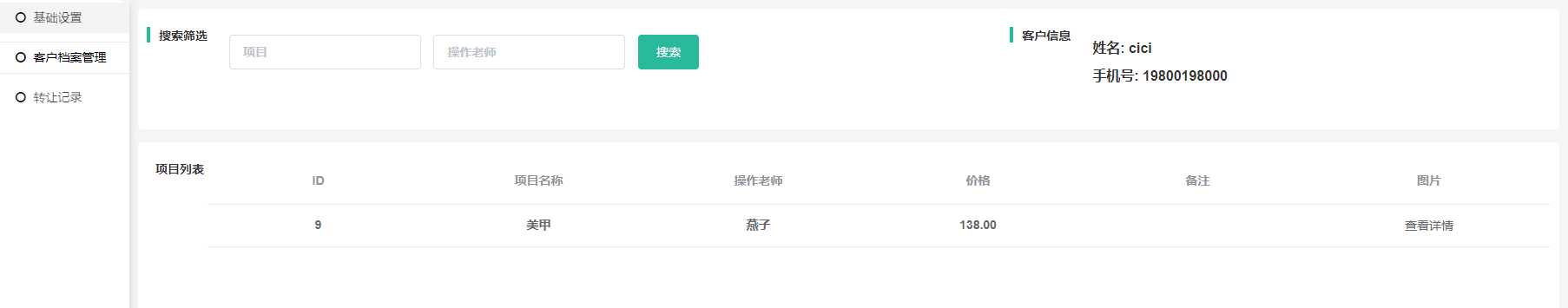 二、点击进入顾客档案管理页面,显示管理的所有顾客档案,可通过手机号、客户名称、项目名称、老师名称筛选