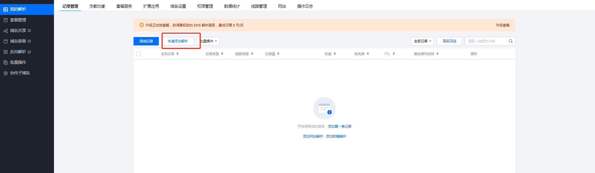 1、登录 DNSPod 管理控制台 快速添加解析。如下图所示: