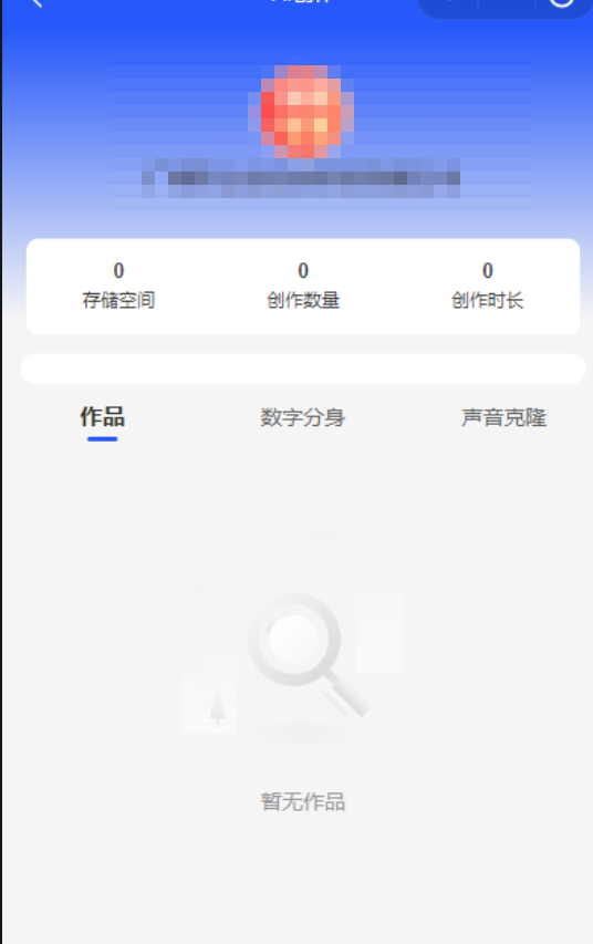 展示个人创作的作品、数字分身、声音克隆,点击数字分身/声音克隆可以进行创建数字分身操作
