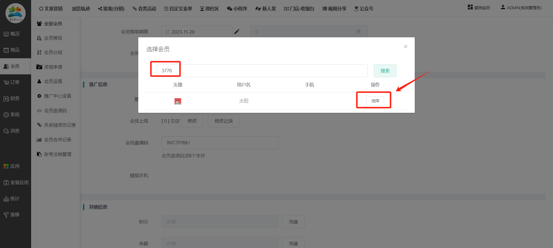 目录 搜索 展开 一、前期准备资料二、数字乡村码-上线操作指南1、服务号的申请流程及认证2、申请小程序流程3、开放平台绑定小程序和公众号三、数字乡村码-系统操作数字乡村码系统管理-概况数字乡村码-商品管理1、发布商品2、商品列表3、商品表单4、商品分类5、品牌管理6、配送模板7、评论管理8、优惠券管理9、商品标签10、退货地址设置11、满额优惠12、批量操作13、配送方式14、基础设置15、商品隐藏四、数字乡村码-会员管理1、全部会员2、会员等级3、会员分组4、资格申请5、会员设置6、推广中心设置7、会员邀请码8、会员关系链修改关系链修改记录9、会员合并记录10、账号注销管理11、会员设置中心五、数字乡村码-订单管理1、订单管理列表2、订单处理流程3、订单状态4、订单修改价格5、订单退款退货6、多包裹发货7、批量发货订单操作步骤8、催发货订单9、物流查询六、数字乡村码-财务管理1、余额设置2、会员余额3、充值记录4、转让记录5、余额明细6、收入明细7、提现设置8、提现统计9、积分管理10、转账审核11、收益广告12、批量充值七、数字乡村码-系统管理1、商城入口2、商城设置①、商城设置②、订单设置③、物流查询④、短信⑤、联系方式⑥、分类⑦、优惠券⑧、分享⑨、幻灯片⑩、广告位⑫、地图设置3、交易设置4、微信模板消息自定义消息模板(新版)自定义消息模板(旧版)小程序消息模板公众号模板消息变更公告5、语言设置6、权限管理7、多媒体管理八、数字乡村码-消息管理九、数字乡村码-应用管理十、数字乡村码系统-数据统计十一、数字乡村码-页面装修DIY1、模板管理2、店铺页面3、顶部导航4、底部导航5、DIY模板市场6、首屏广告7、基础设置8、装修DIY尺寸建议十二、供应商功能插件操作指南1、供应商2、门店-收银台门店申请和使用步骤门店管理①、门店-收银台 营销设置②、门店-收银台 分润设置门店分类门店申请门店审核门店商品门店商品订单收银台订单数据统计核销员基础设置默认设置门店装修3、微社区4、会务活动十三、营销插件操作指南活动报名提货卡新人奖微店问卷调查积分视频分享1、视频分享基础设置2、视频分享发现管理3、视频分享分类管理4、视频分享评论管理5、视频分享分红记录6、视频分享短视频中心每日红包幸运大抽奖签到优惠券二维码任务奖励优惠劵文章音频文章付费文章限时购新海报拓客卡操作流程积分活动素材中心视频红包十四、入驻门店应用类1、门店预约2、附近商品3、门店定位设置4、门店控制5、门店满额包邮6、门店满额减7、导入商品8、门店搜索9、门店股东10、核销券11、多门店核销1、商城后台设置2、前端功能演示十五、常见问题1、后台登录密码修改流程2、会员-余额,积分,后台如何进行充值与扣除3、如何修改上下级关系4、一种万能的获取商城小程序路径的方法 暂无相关搜索结果! 阅读次数:1879 本文档使用 模王系统 发布 8、会员关系链修改 8、会员关系链修改一.如何修改上下级关系?1.会员-全部会员-可以通过搜索用户的独立ID,或者用户微信昵称,找到此会员,然后点击右边的(操作)2.再点击会员详情。3.滑到下面,有个推广信息-会员上线,点击修改4.输入上级的ID号,点击搜索,出来此上级会员后点击选择。5.滑到最下面,一定要点击提交按钮。文档更新时间: 2023-11-30 14:56 作者:链上旅行