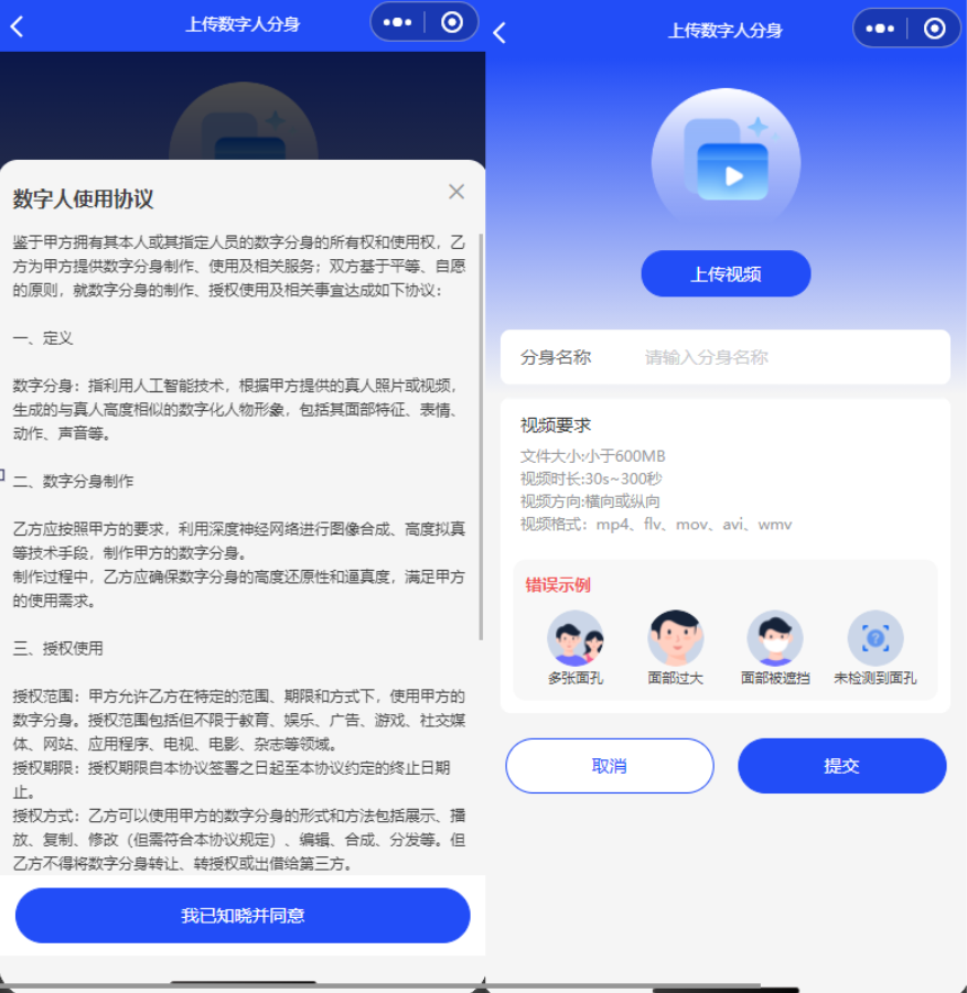 数字分身协议内容:设置前端创建数字分身时的弹窗内容