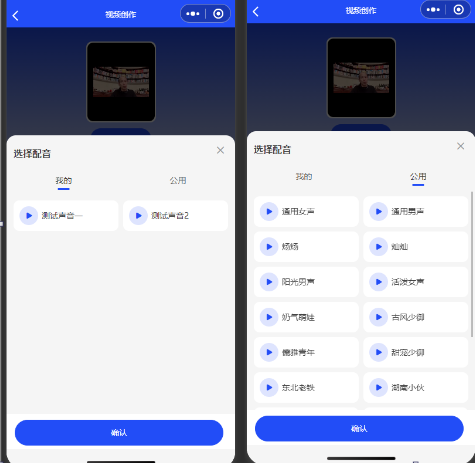 可选择自己生成的配音,或者使用公共配音进行合成视频。点击播放按钮可试听
